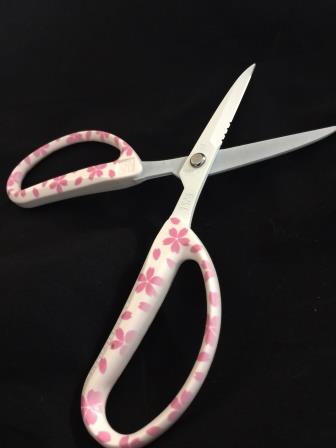 伝統の技が冴える 鋭く絶妙な切れ味made in Japan Professopnal scissorsアレンジはさみフッ素 "SAKURA" フローリスト人気のアレンジはさみに限定プリント登場!・ベタつかずヤニがつきにくい高級フッ素加工刃・ギザ刃付きでフラワー用ワイヤー#18を逃がさずカット!・刃先キャップ付き・ステンレス刃&ソフトグリップ品質表示●刃/高級ステンレス刃物鋼、高級フッ素加工●グリップ/ソフトグリップ●キャップ/PP●全長:160mm 刃長:45mm 重量:60g(キャップ含まず)株式会社近正